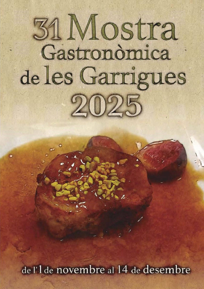 1 novembre - 14 desembre 2025Mostra Gastronòmica de les Garrigues  DescripcióLa 31a Mostra Gastronòmica de les Garrigues, de l’1 de novembre al 14 de desembre, ofereix plats amb oli nou i productes locals en diversos restaurants, combinant gastronomia, paisatge i tradició. Els visitants poden complementar l’experiència amb oleoturisme i rutes culturals per conèixer el patrimoni de la comarca, des de les pintures rupestres del Cogul fins als castells i la pedra seca.